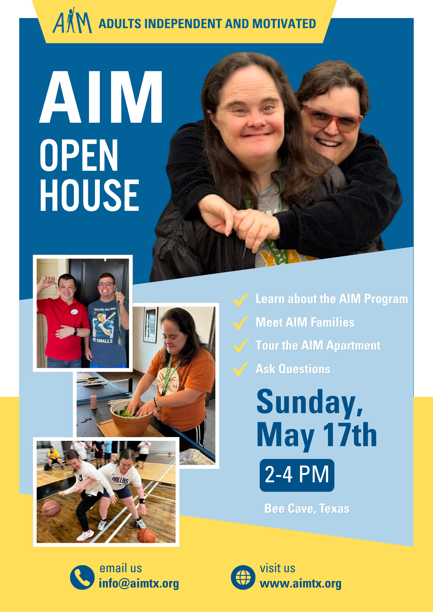 Event Details: Join us to hear from AIM staff, families, and AIMers, learn more about our program, tour the apartment complex, and ask any questions you may have. This is a great opportunity to get a feel for the community and see what AIM is all about.